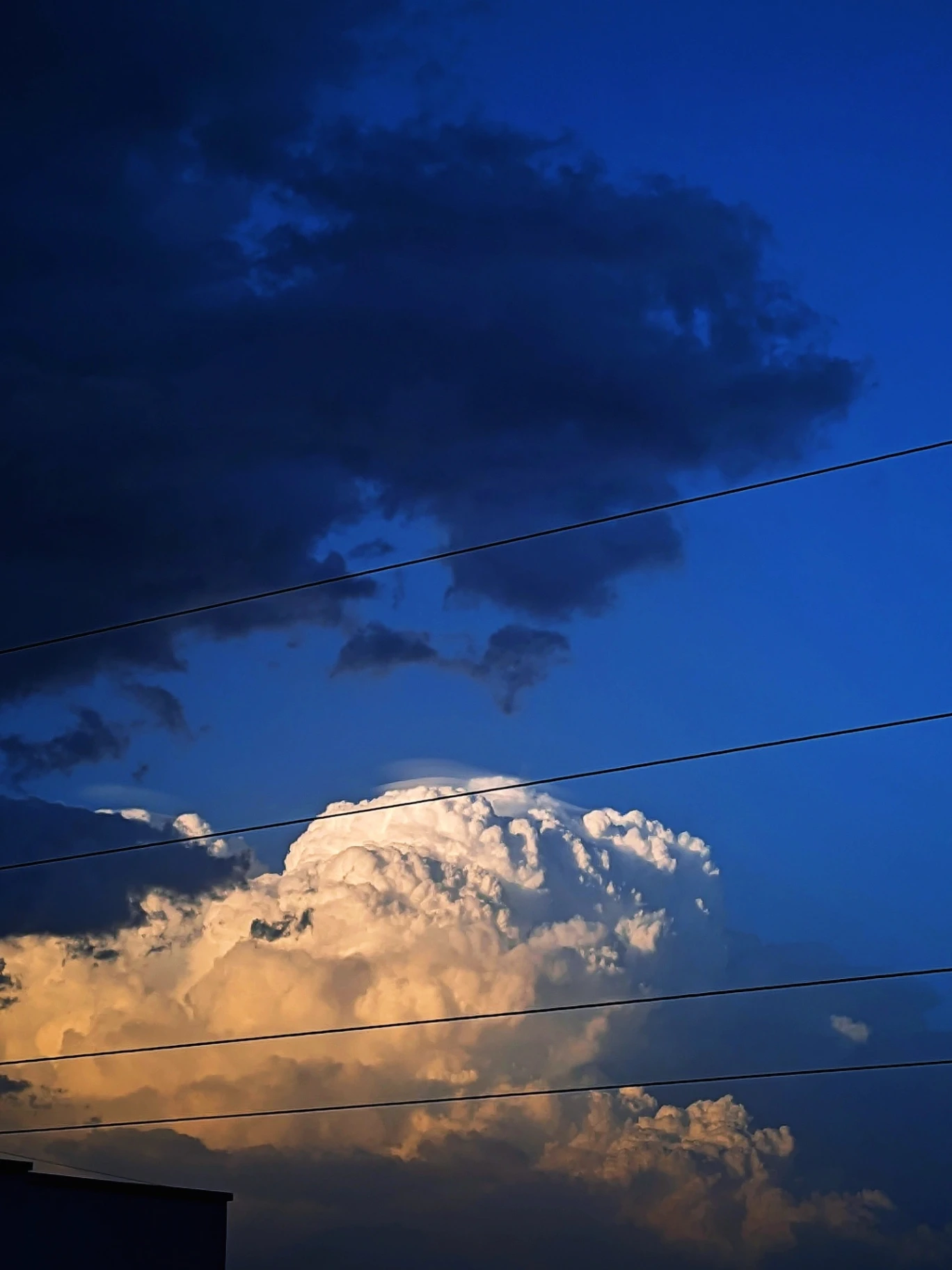 At twilight's edge, a colossal cumulus cloud ascends, its foundation kissed with the day's final golden light. Against a deepening azure sky, its brilliant white summit reaches for the encroaching darkness of brooding storm clouds gathering above.