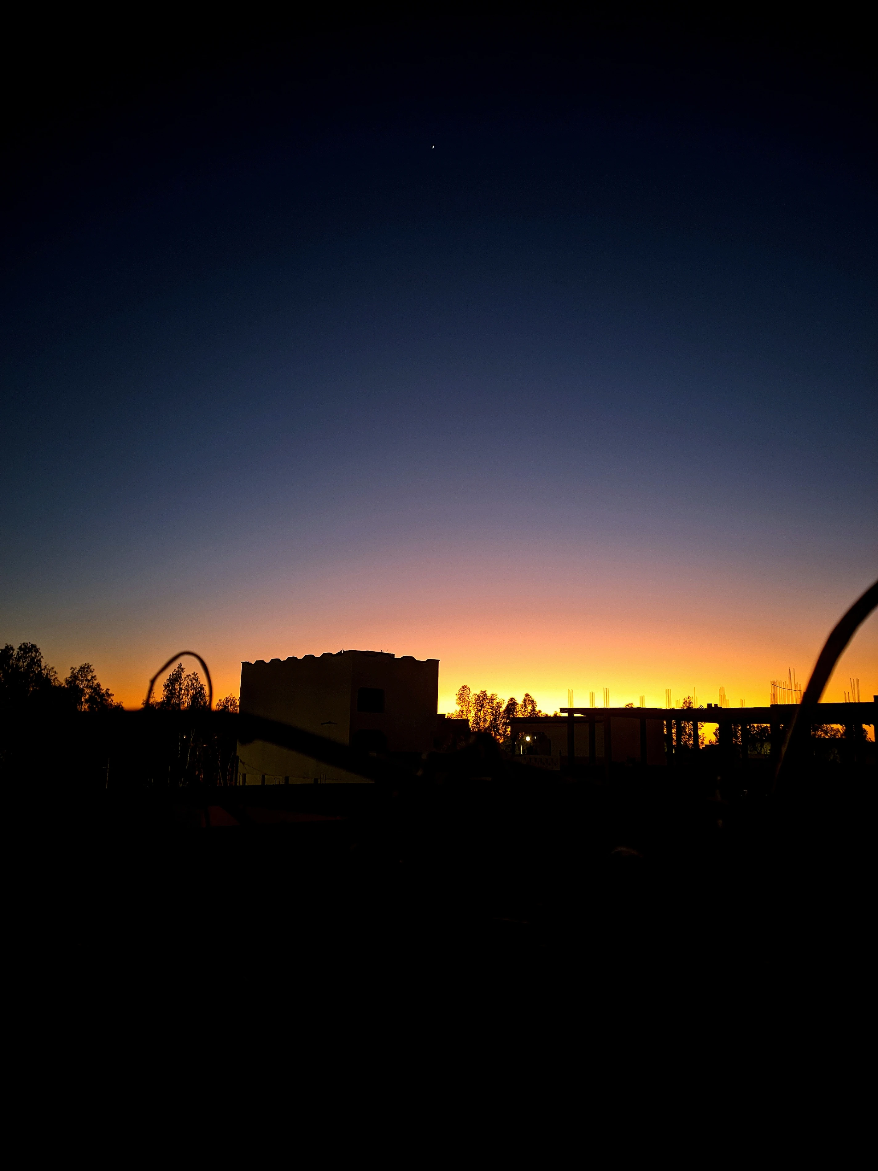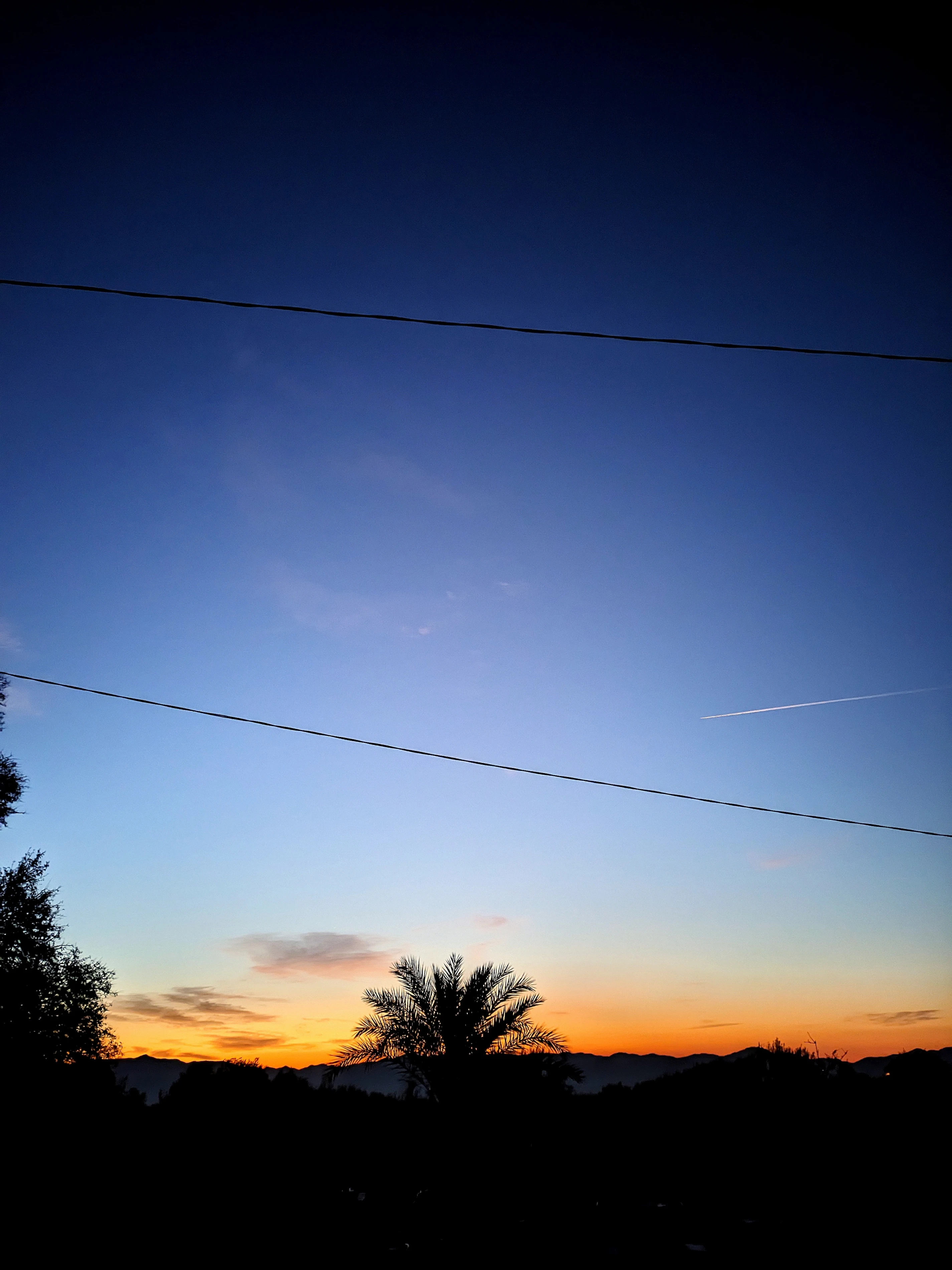 An electric symphony of color paints the sky as the sun dips below the horizon. Below, a line of trees stands as a dark, jagged silhouette, while the powerful lines of human endeavor stretch towards the vanishing light. Above, clouds drift in a magnificent mosaic of soft blues, fiery oranges, and deep grays, a fleeting canvas of nature's artistry.