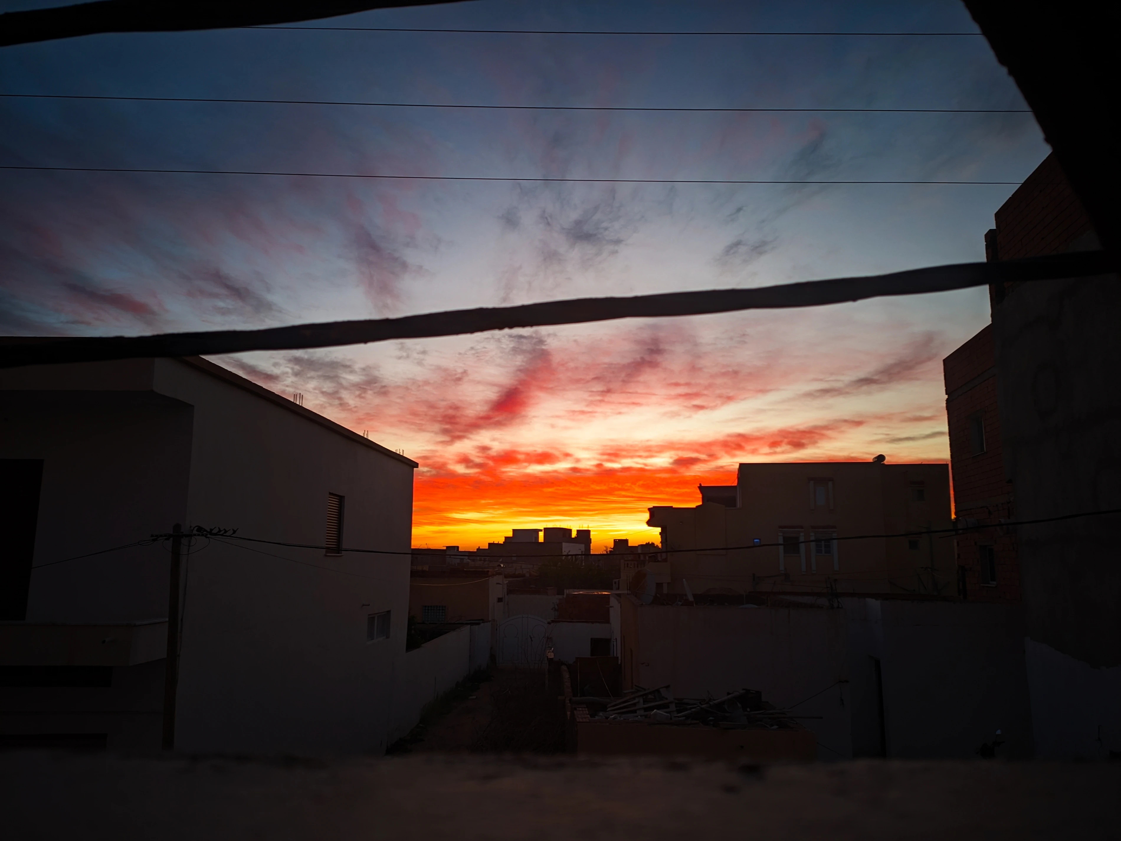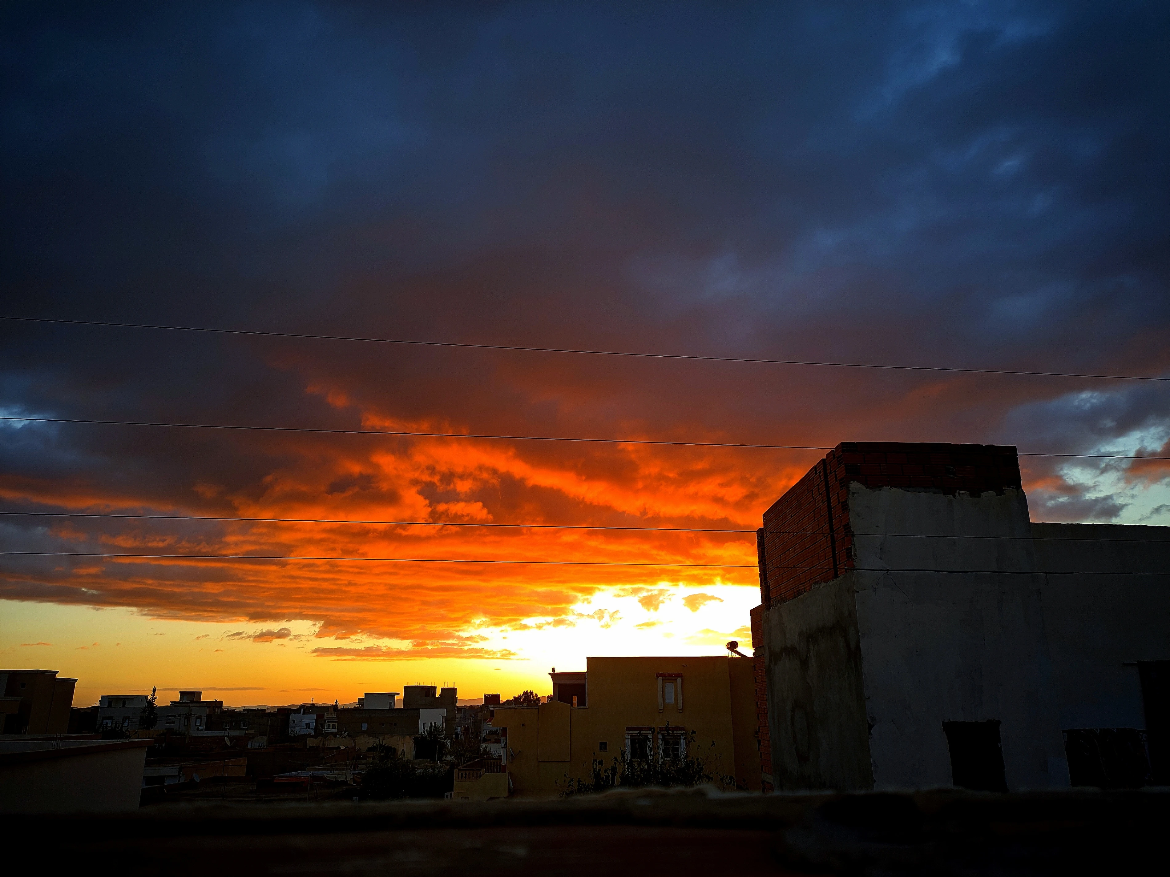 A city's rooftops are silhouetted against a sky ablaze, where the dying sun sets the clouds afire in a breathtaking display of fiery orange and crimson. Above, a deep, brooding expanse of storm clouds encroaches, their charcoal forms a dramatic contrast to the vibrant spectacle below.