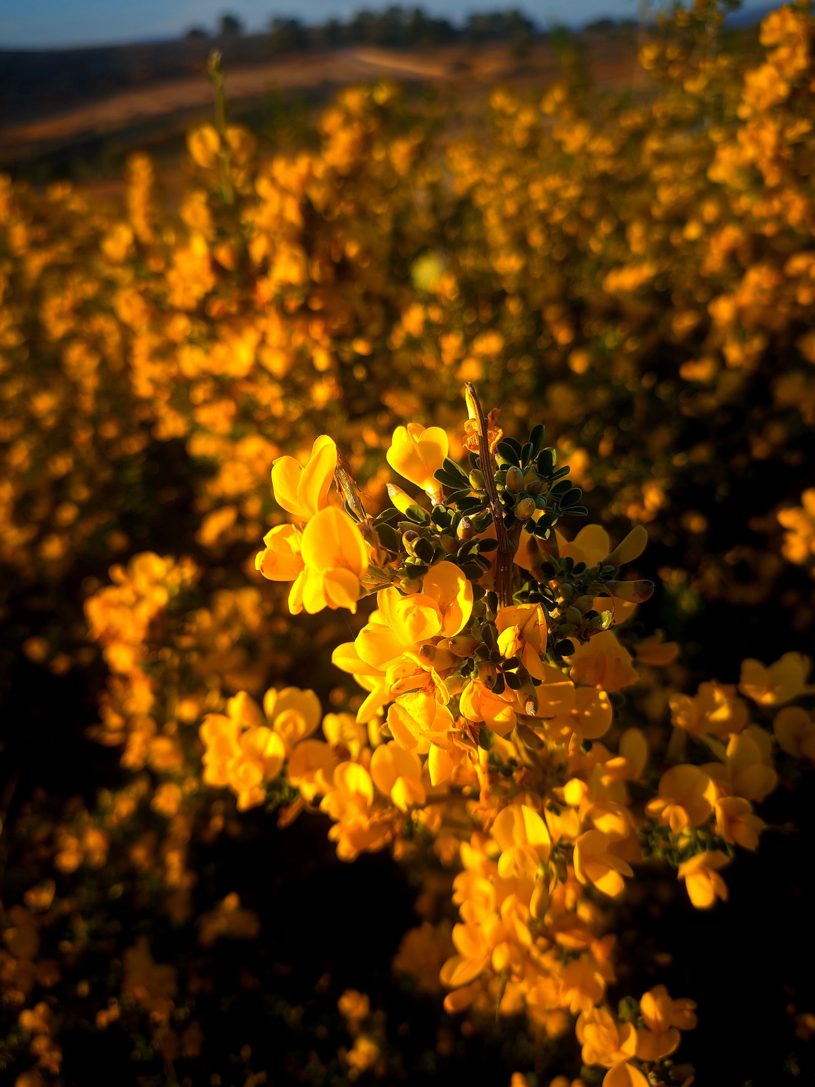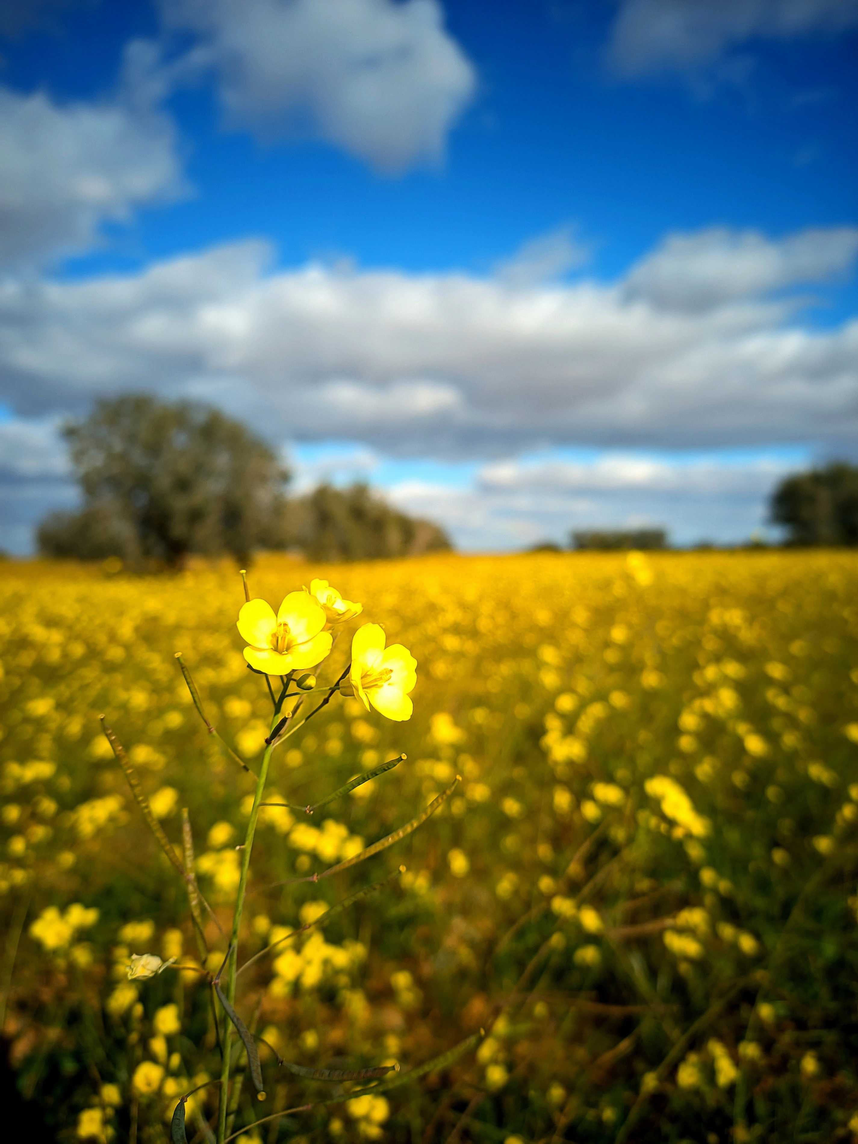 A sea of vibrant yellow blossoms stretches to the horizon, a golden carpet under a vast, cerulean sky dotted with fluffy white clouds. In the foreground, a pair of delicate flowers stands sentinel, their cheerful faces turned toward the light, a testament to the quiet, persistent beauty of the wild.