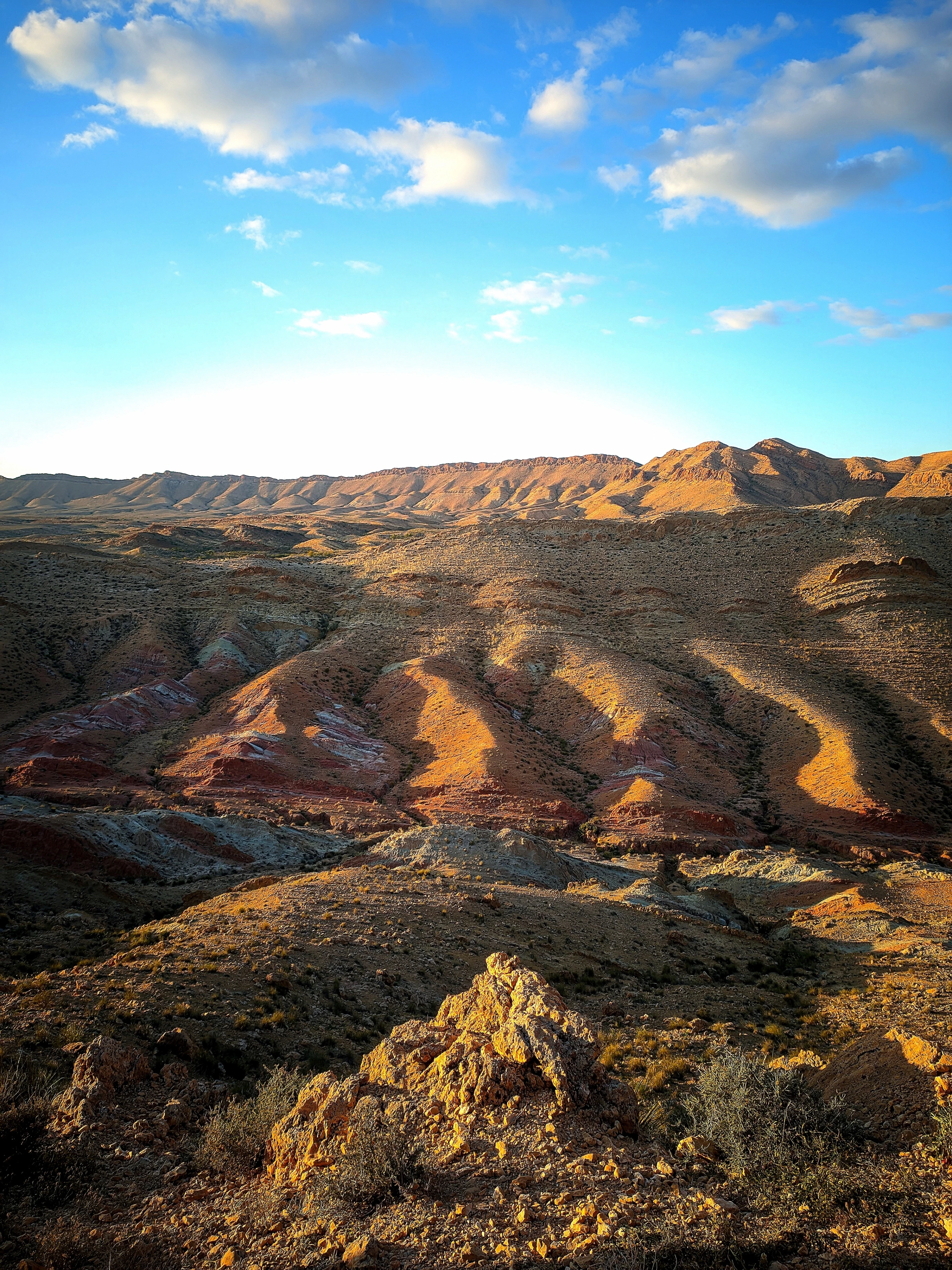 In the last, golden hours of the day, a rugged and ancient landscape is bathed in a warm, ethereal glow. The sun's low angle etches deep shadows into the rolling hills, revealing the subtle contours and varied textures of the land. The sky above, a soft palette of blue and white, provides a serene backdrop to this timeless panorama.