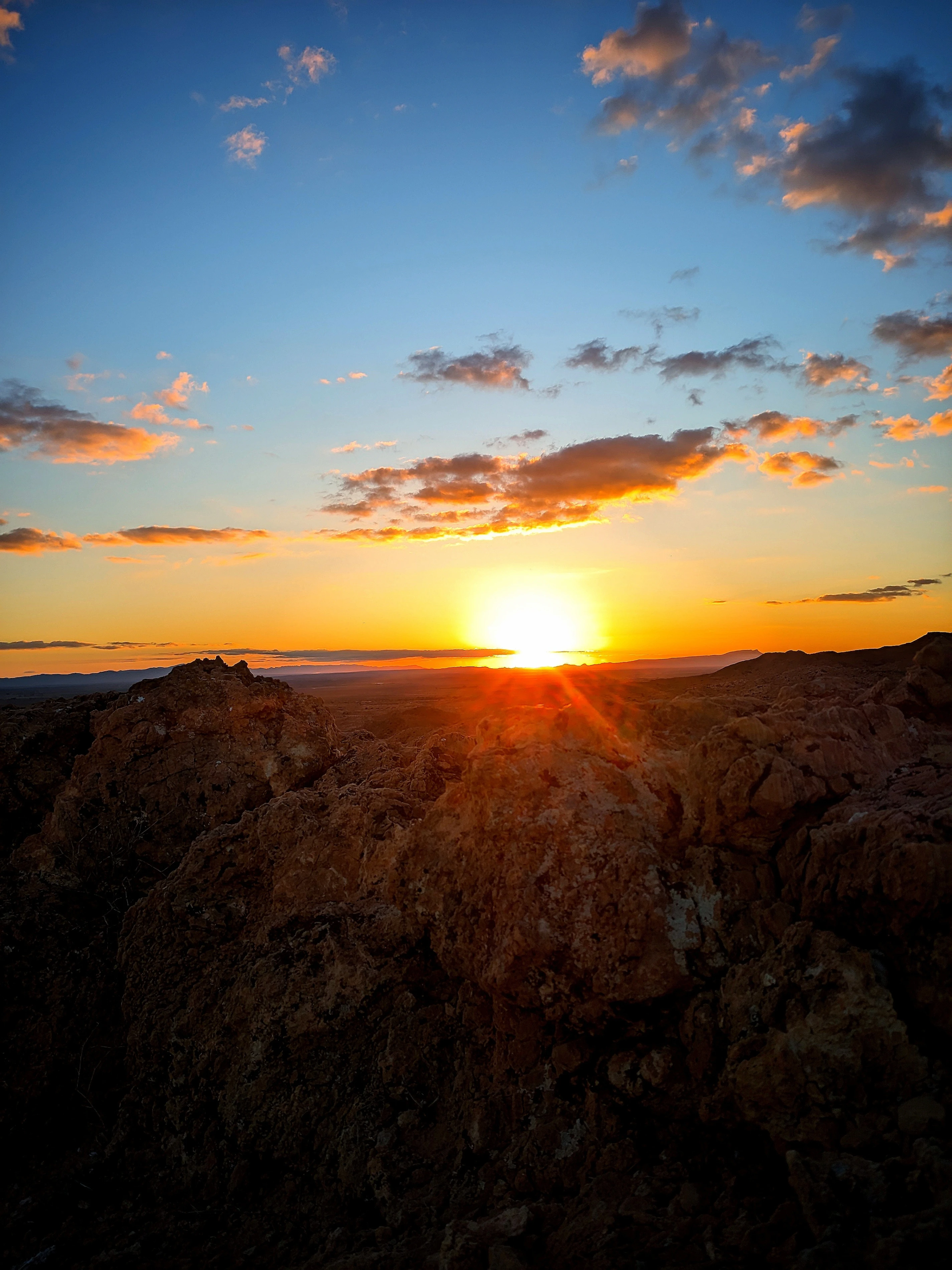 The sun, a blinding orb of pure fire, sinks below the distant horizon, casting long rays of golden light across a harsh and rocky foreground. The sky explodes in a riot of color, with hues of deep orange, amber, and soft peach painting the clouds, signaling the day's magnificent, final act.