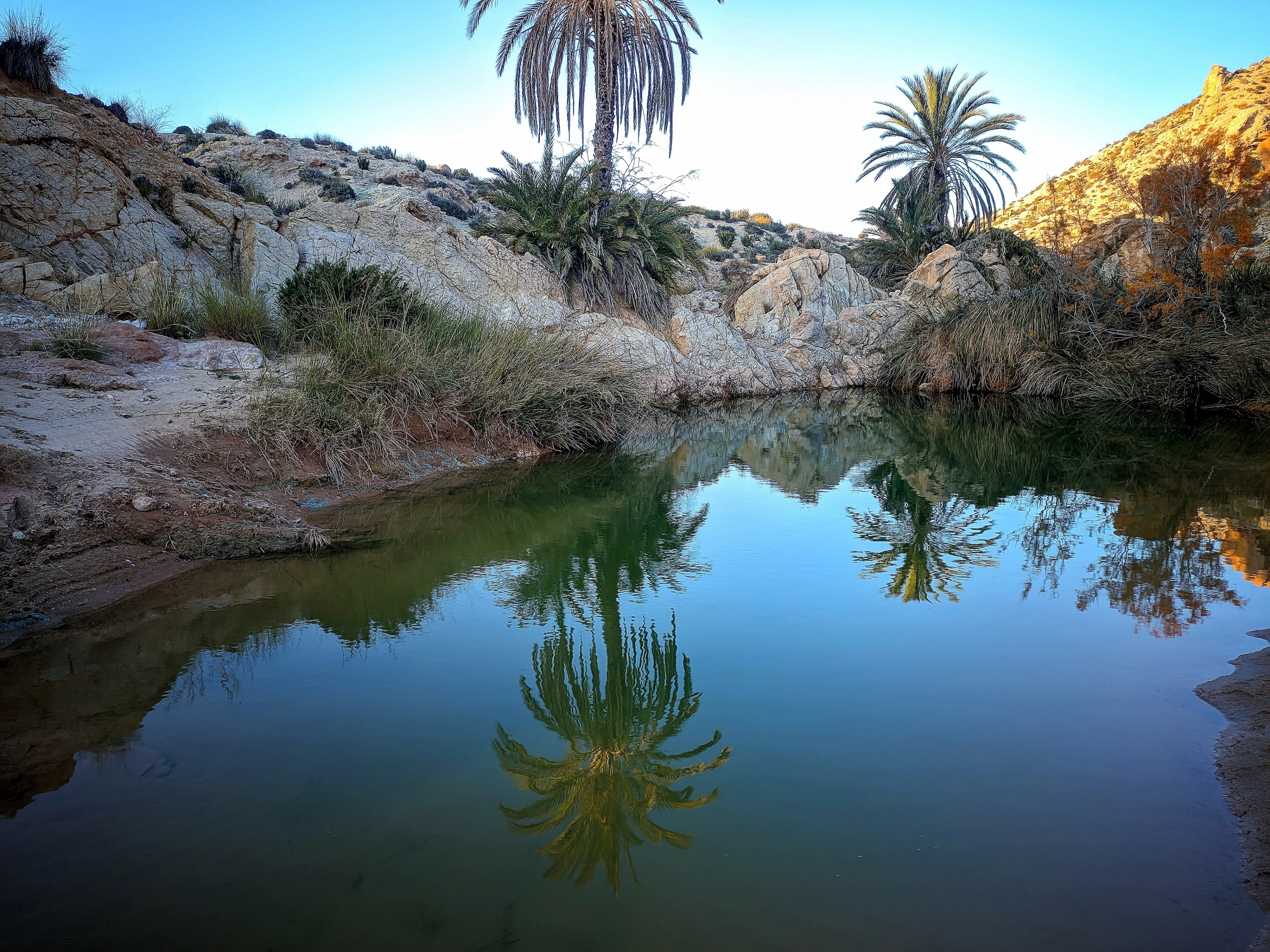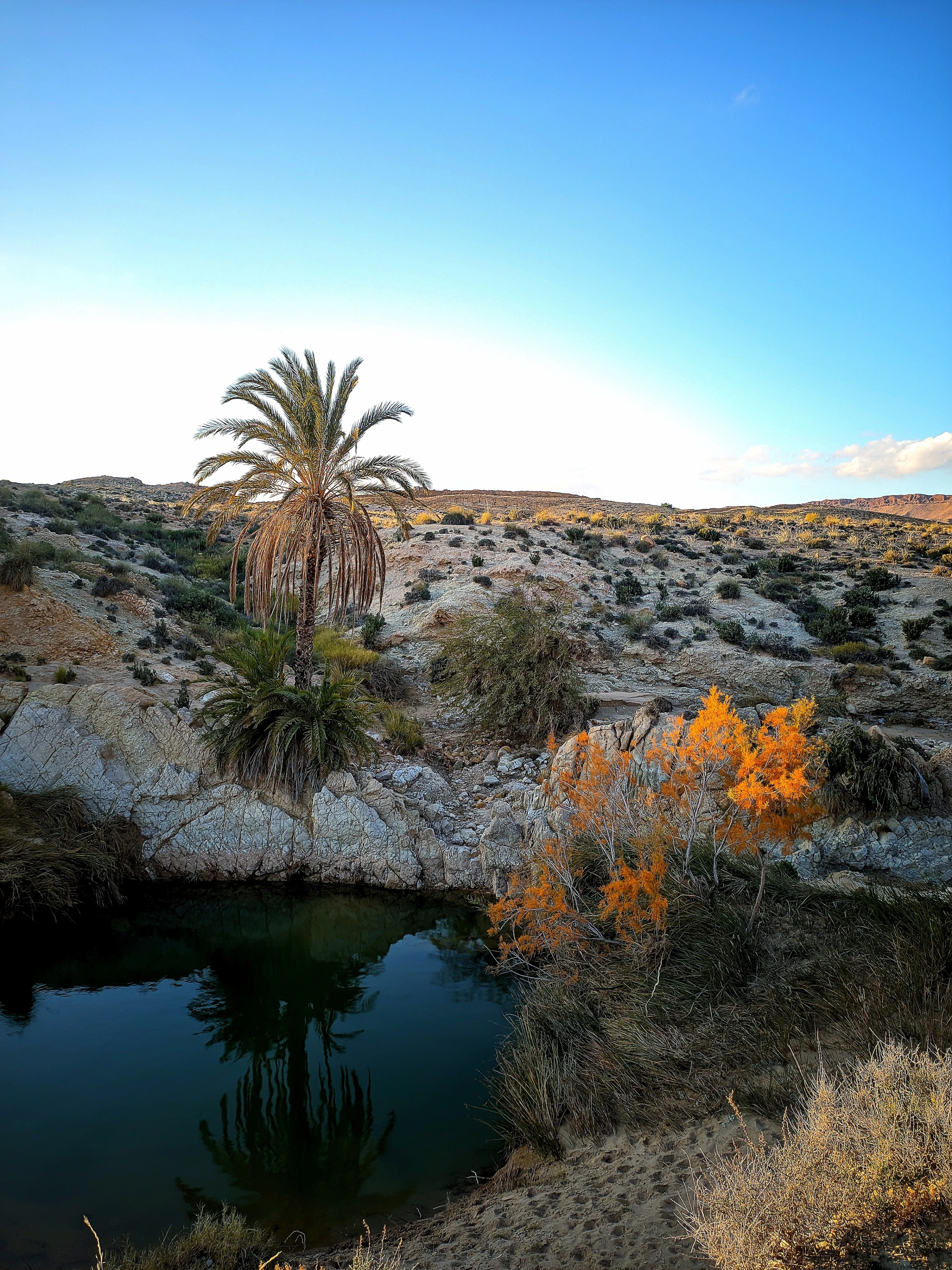 Beneath a vast, clear sky, a secluded oasis thrives. A stately palm tree stands tall beside a tranquil pool, its reflection a mirror image on the still, dark water. The surrounding arid landscape, a mix of pale rocks and sparse vegetation, frames this vibrant pocket of life, a beautiful and surprising sanctuary in the wilderness.