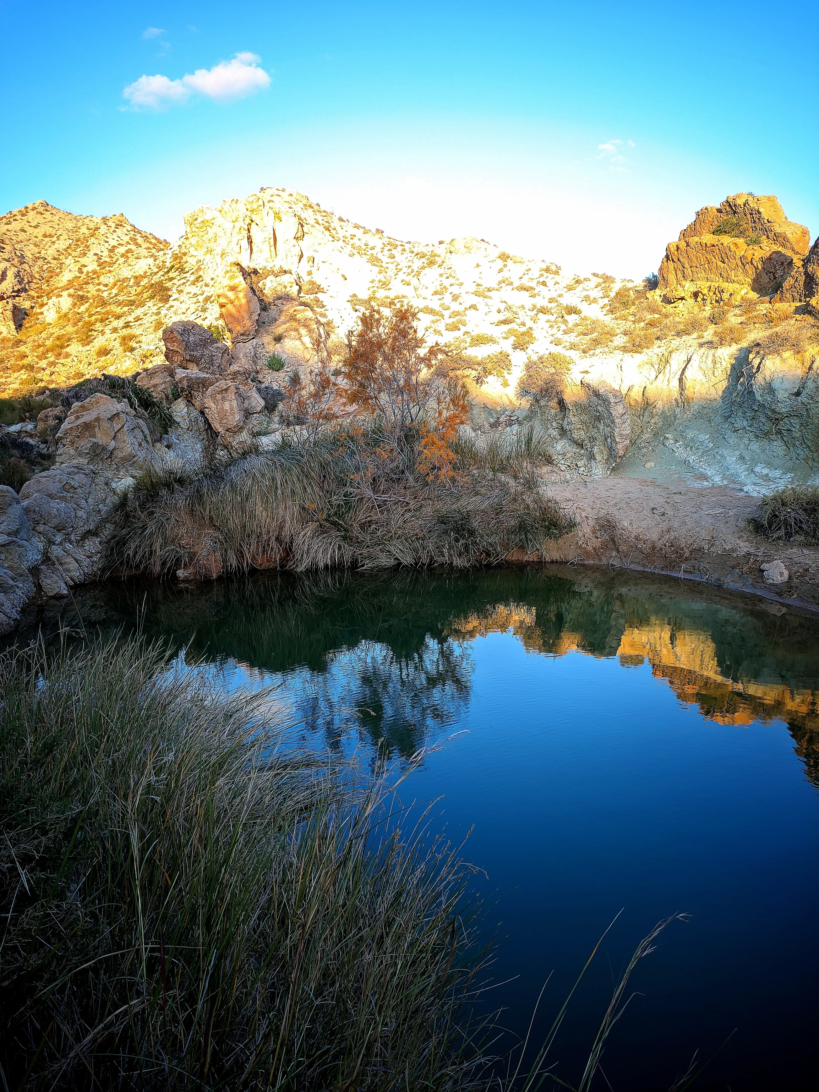 A peaceful watering hole is a jewel in a rugged landscape, its glassy surface reflecting the jagged, sun-drenched cliffs that surround it. Reeds and tall grasses frame the water, adding a touch of softness to the scene. The deep blue of the pool stands out against the muted tones of the earth, a tranquil and vital heart in this wild terrain